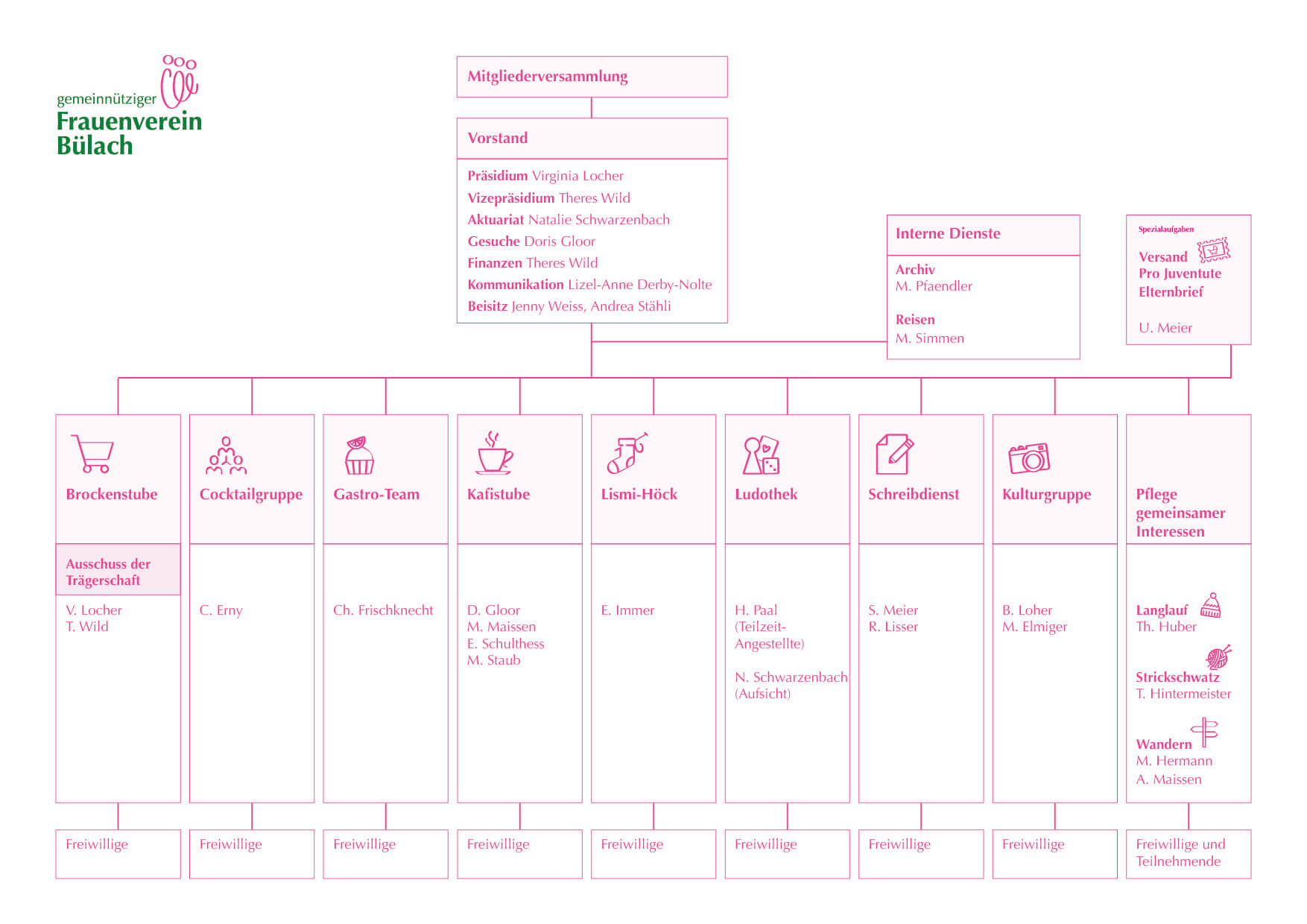 Der Verein zählt über 500 Mitglieder und engagiert sich seit 1867 in ehrenamtlicher Tätigkeit für ein lebendiges, lebenswertes Miteinander im Raum Bülach. Wir vernetzen Frauen jeden Alters, bieten zahlreiche Möglichkeiten zur Gestaltung einer aktiven Freizeit und ermöglichen es den Mitgliedern, ihre Interessen zu vertiefen, neue Talente zu entdecken und ihre Fähigkeiten für andere einzusetzen.